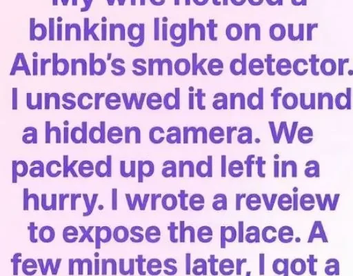 It began with a blink—small, rhythmic, almost invisible. My wife, Pilar, noticed it first, half-asleep in our Airbnb bedroom. “Why is the smoke detector flashing?” she whispered. I climbed onto a chair, twisted the plastic dome, and froze. There, buried in the housing, was a small black lens. We didn’t speak; we just packed. Within…
