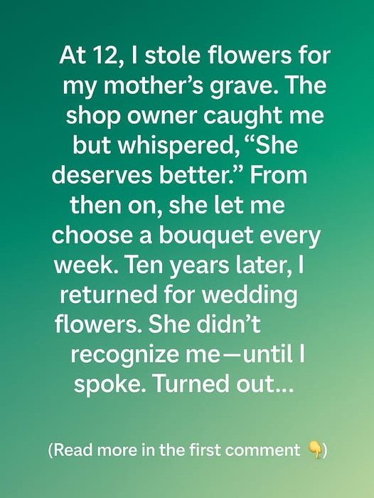At 12, I stole flowers for my mother’s grave. I didn’t do it out of mischief—I just wanted something beautiful to place beside her headstone. My family had very little then, and grief felt heavier when all I had to offer were wildflowers I’d gathered from the roadside. That day, I slipped a small bouquet…