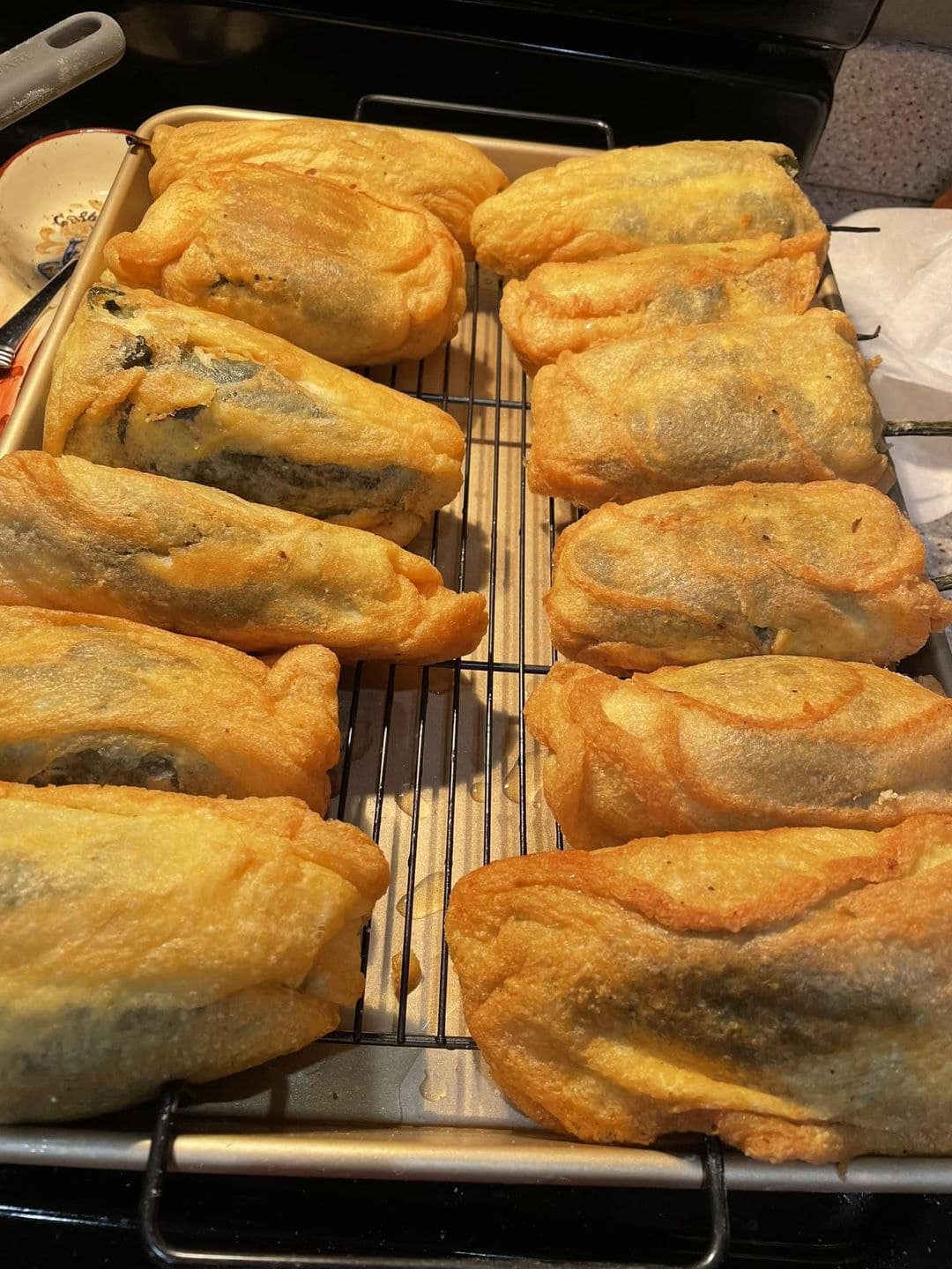 Assembly and Cooking: After stuffing and battering, the chiles are carefully fried in batches. They are then drained on paper towels to remove excess oil before serving.