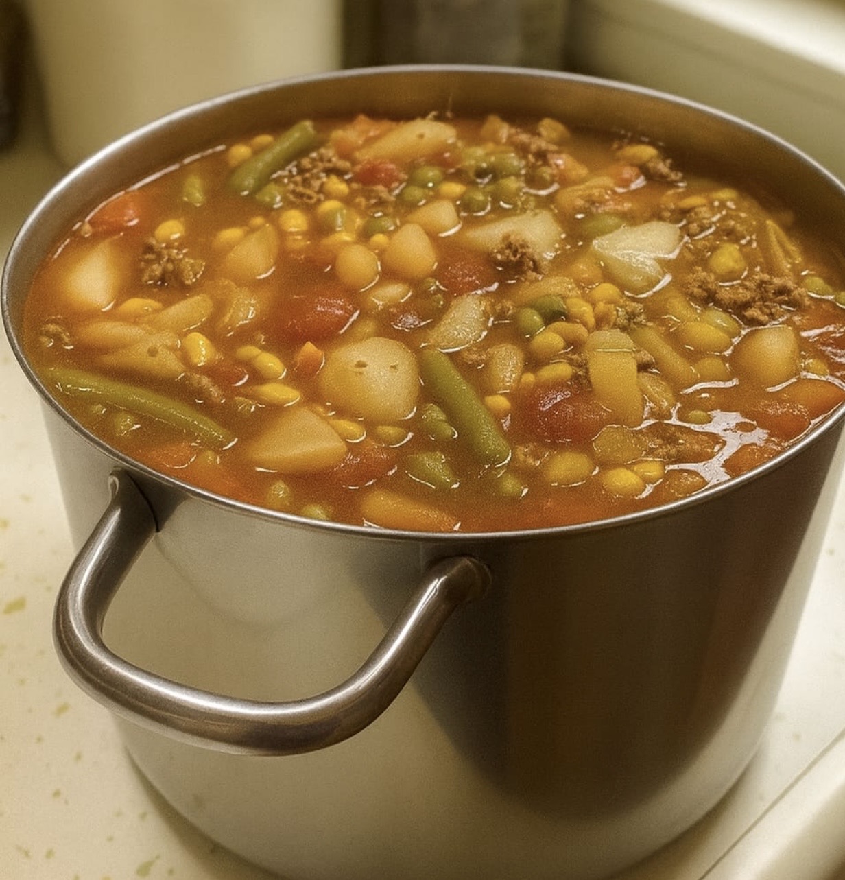 - Add beef broth, potatoes, green beans, corn, peas, tomatoes, and white beans. Stir well to combine.