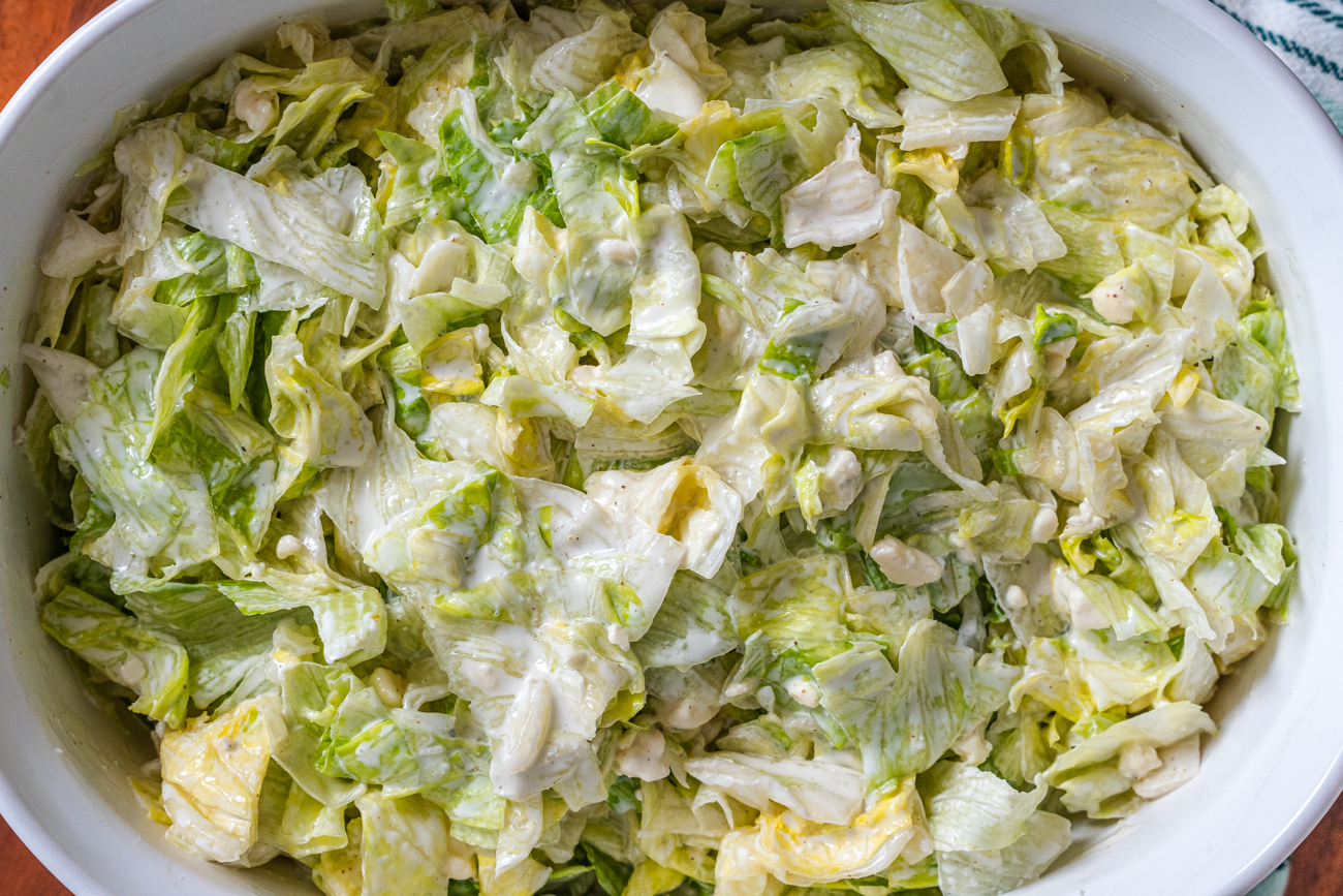 - Add chopped lettuce to a large bowl and dress right before serving. Toss until evenly coated.