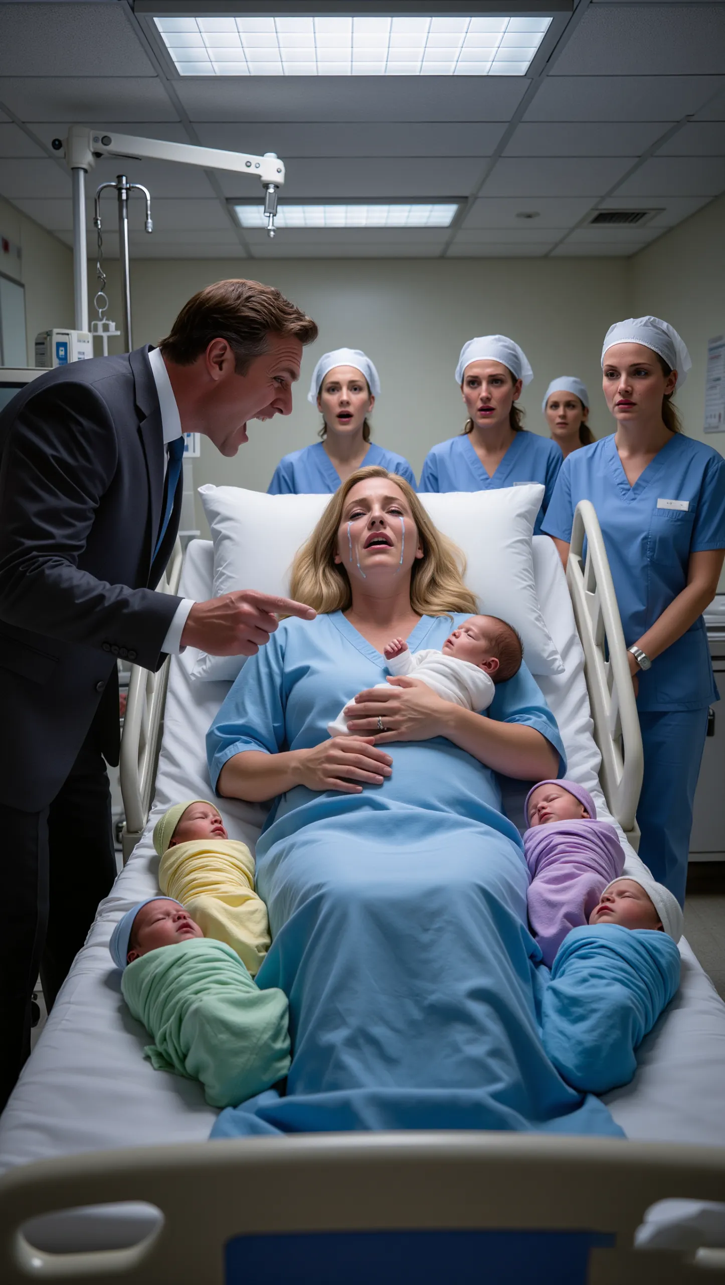 Anna lay exhausted, trembling from hours of labor, her skin damp with sweat. In her arms rested five tiny newborns, each wrapped in soft pastel blankets. Triplets would have amazed the hospital staff, but quintuplets? That was beyond rare. It should have been a miracle. Yet no one in the room looked at them with wonder.